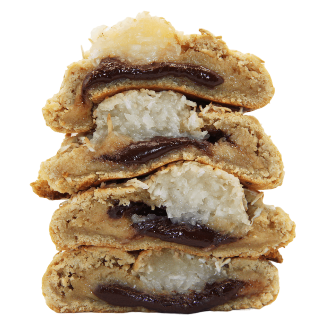 Cookie Dough mit saftiger Kokosnuss Masse und einem schmelzenden Kern aus belgischer Zartbitterschokolade.